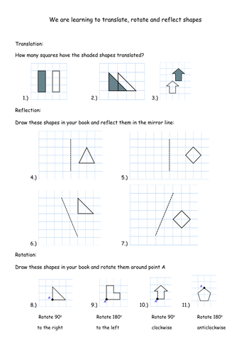 Math worksheets reflection rotation translation. study.com › learn › lessonTranslation, Rotation & Reflection | Overview, Differences ... Dec 15, 2021 · Learn what translation, rotation, and reflection mean in math. Identify examples of these transformations and discover the key differences between them. Updated: 12/15/2021 Transformation - Translation, Reflection, Rotation, Enlargement VerkkoTypes of transformation, Translation, Reflection, Rotation, Enlargement, How to transform shapes, GCSE Maths, Describe fully the single transformation that maps A to B, Enlargement with Fractional, Positive and Negative Scale Factors, translate a shape given the translation vector, How to rotate shapes with and without tracing paper, How to … Reflection, Translation, and Rotation Worksheets VerkkoPrintable worksheets. Decide whether the shapes are moved with a reflection, translation, or rotation. ... More Math Worksheets. Reading Comprehension. Reading Comprehension Gr. 1. ... Draw the rotation, translation, or reflection of each shape on the dotted grid paper. 6th through 8th Grades. View PDF. › reflection-rotationReflection, Rotation and Translation - Online Math Learning learn about reflection, rotation and translation, Rules for performing a reflection across an axis, To describe a rotation, include the amount of rotation, the direction of turn and the center of rotation, Grade 6, in video lessons with examples and step-by-step solutions.